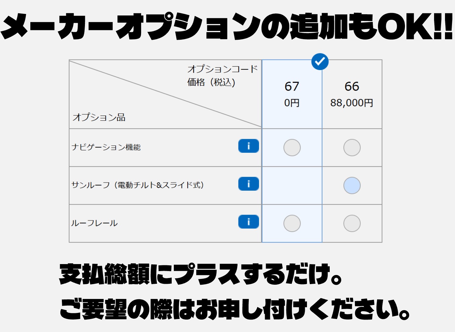 支払総額(税込) | 3,712,000 円 | 3,787,680 円 | 3,791,800 円 |
