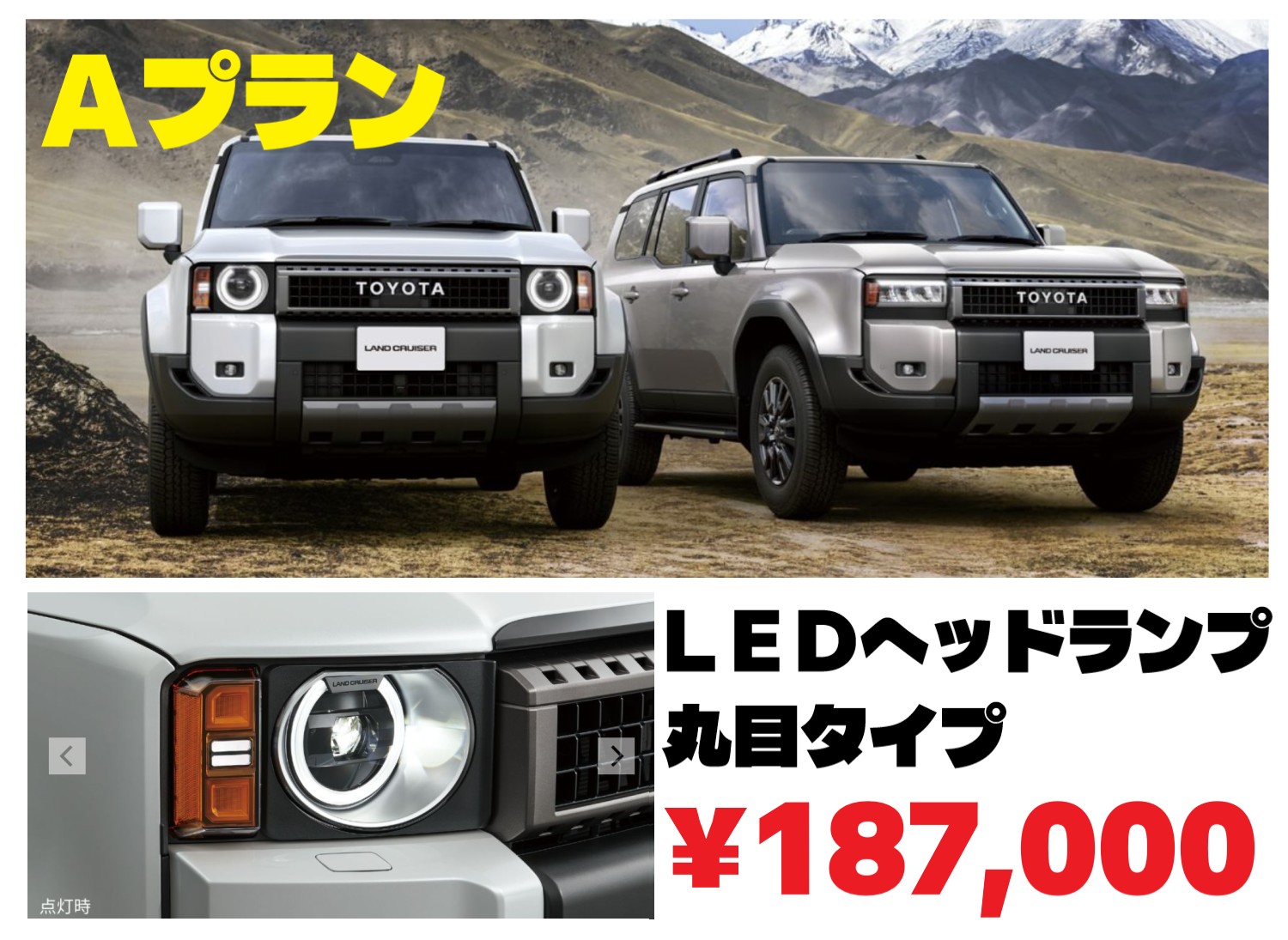 | 補足 | --- | ネオクラシック。クルーな丸目LEDヘッドランプ。歴代のランドクルーザーを彷彿とさせる丸目デザインが逆に新しい。 | CPCプレミアムコーティングダブルGN:おクルマの「輝き」「傷からの保護」「撥水効果」を長期間、良好に保ちます。保守状況や駐車場の状況にもよりますが3年から5年の効果を持続させます。気持ちよくおクルマを維持したい方に大好評です。 |